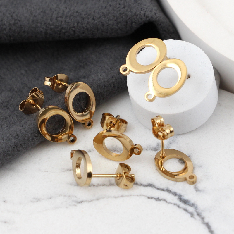 Bigle sztyfty do kolczyków, wykonane ze stali szlachetnej typu 304, przeznaczone do podwieszania elementów ozdobnych, pozłacane.
