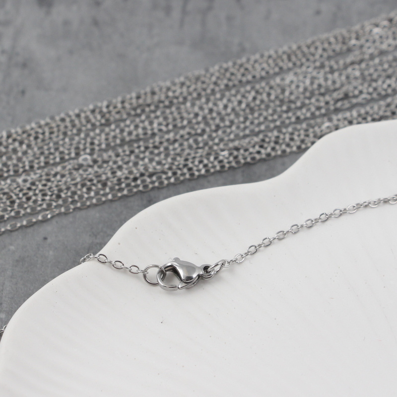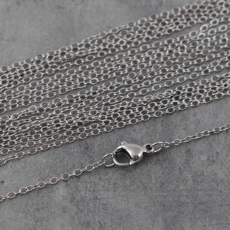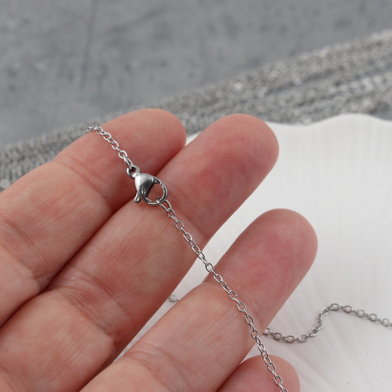 Gotowy łańcuszek o owalnych, drobnych ogniwkach, wykonany ze stali chirurgicznej, karabińczyk 10mm. Bardzo delikatny splot.