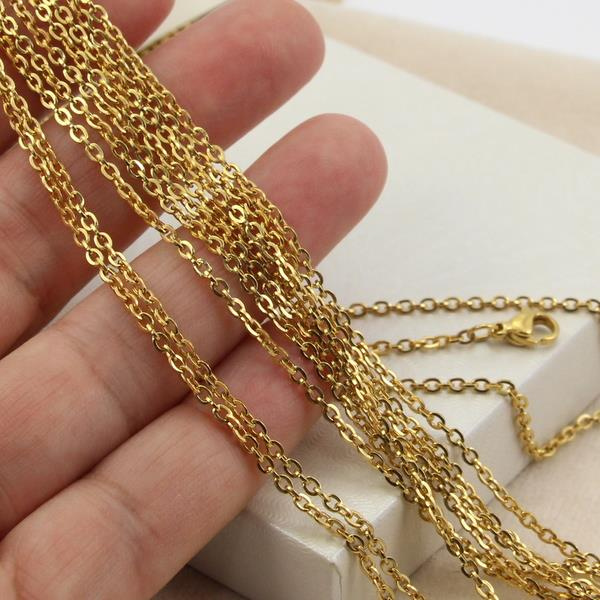 Gotowy łańcuszek o owalnych, drobnych ogniwkach, wykonany z pozłacanej stali chirurgicznej, karabińczyk 10mm. Delikatny splot.