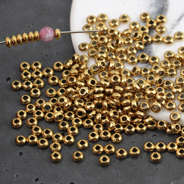 Maleńkie przekładki ze stali szlachetnej, pozłacane w kształcie oponki. Mogą służyć jako ozdoba między koralikami.