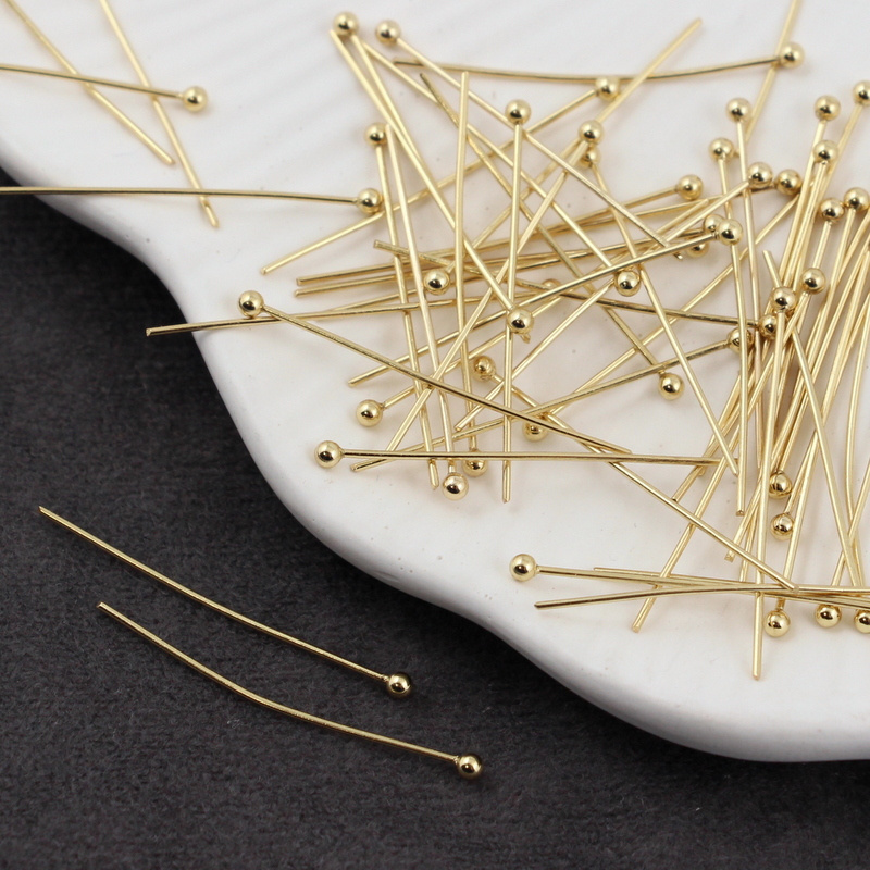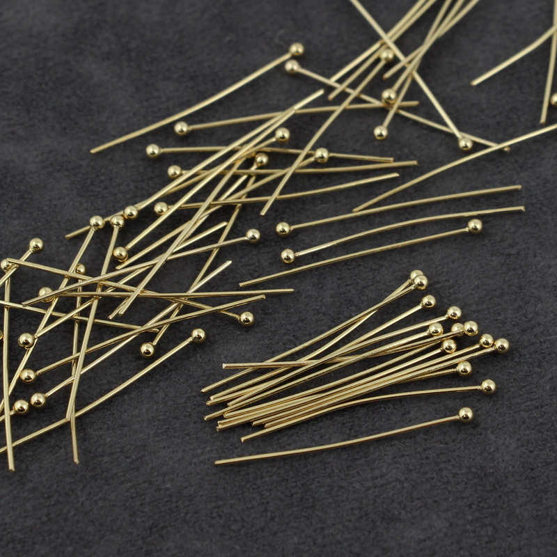 Szpilki ze stali chirurgicznej typu 304 (pozłacana 24kT) o długości 3cm, średnica kulki ok. 1,8mm, grubość drutu 0,6mm.