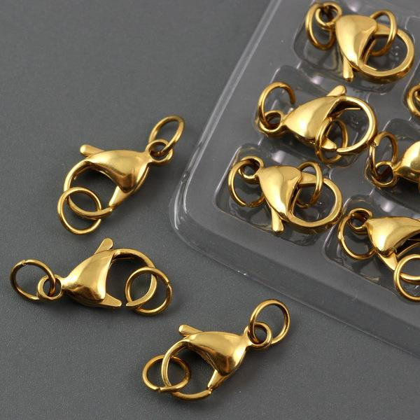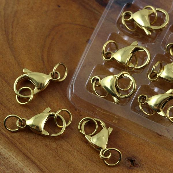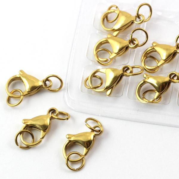 Karabińczyk wykonany ze stali chirurgicznej, pozłacany. Karabińczyk z 2 ogniwkami.