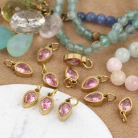Mała zawieszka z ogniwkiem, w kształcie łezki ze szklanym oczkiem w oprawie ze stali pozłacanej.