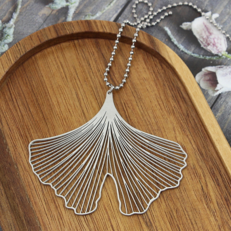 Bardzo duża zawieszka z motywem liścia miłorzębu. Zawieszka sama w sobie jest już okazałą biżuterią, wystarczy drobny łańcuszek lub sznureczek aby efektownie prezentowała się jako długi wisior. Można dołączyć delikatne, kolorowe gronko.