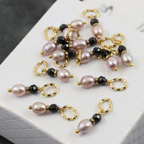 OpisMisternie wykonana filigranowa zawieszka: naturalna perła słodkowodna, spinel, hematyt, na miedzianej szpilce, ogniwko skręcane ze stali chirurgicznej (wielkość ogniwa zewn - 8,5x4mm).