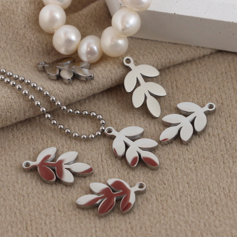 Zawieszka z polerowanej stali szlachetnej w kształcie gałązki z listkami.
