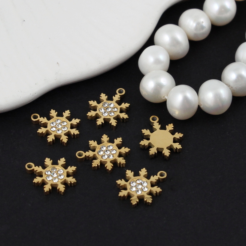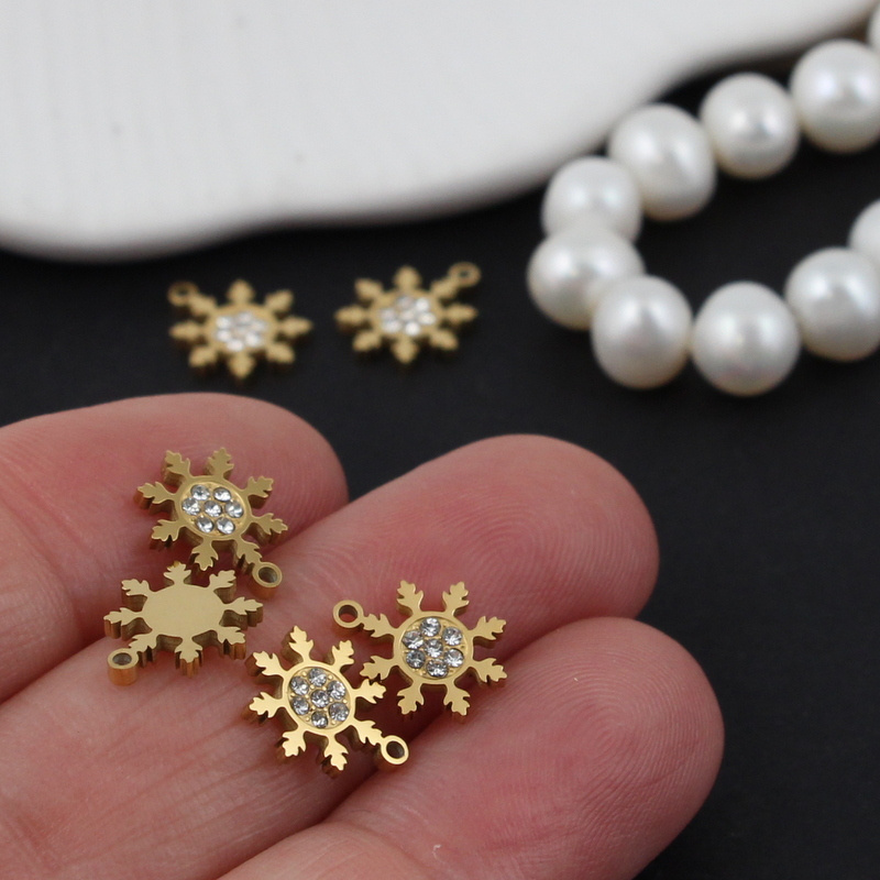 Urocze zawieszki z akcentem zimowym w kształcie złotych śnieżynek, wykonane ze stali nierdzewnej i ozdobione błyszczącymi cyrkoniami, idealne do tworzenia biżuterii o świątecznym lub zimowym charakterze.