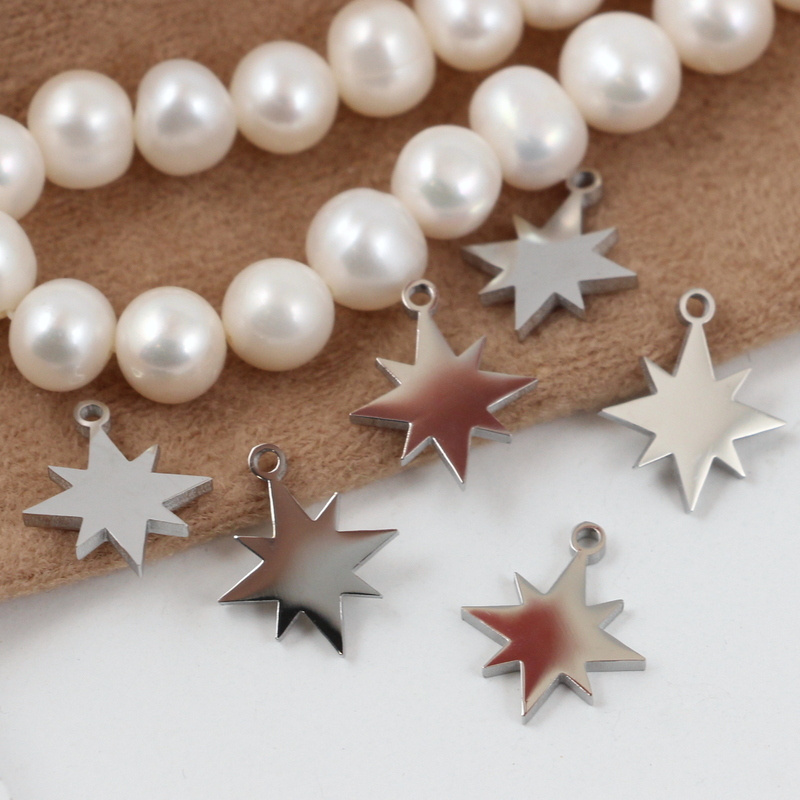 Zawieszka z polerowanej stali szlachetnej typu 304 w kształcie nierównoramiennej gwiazdy.