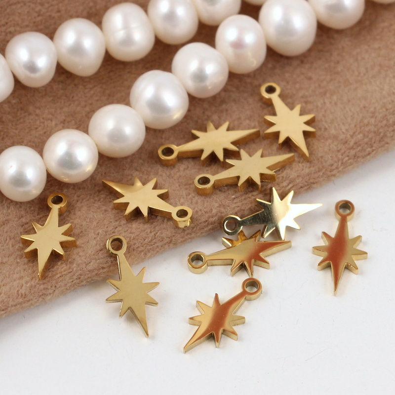 Zawieszka z polerowanej stali szlachetnej typu 304 w kształcie nierównoramiennej gwiazdy.