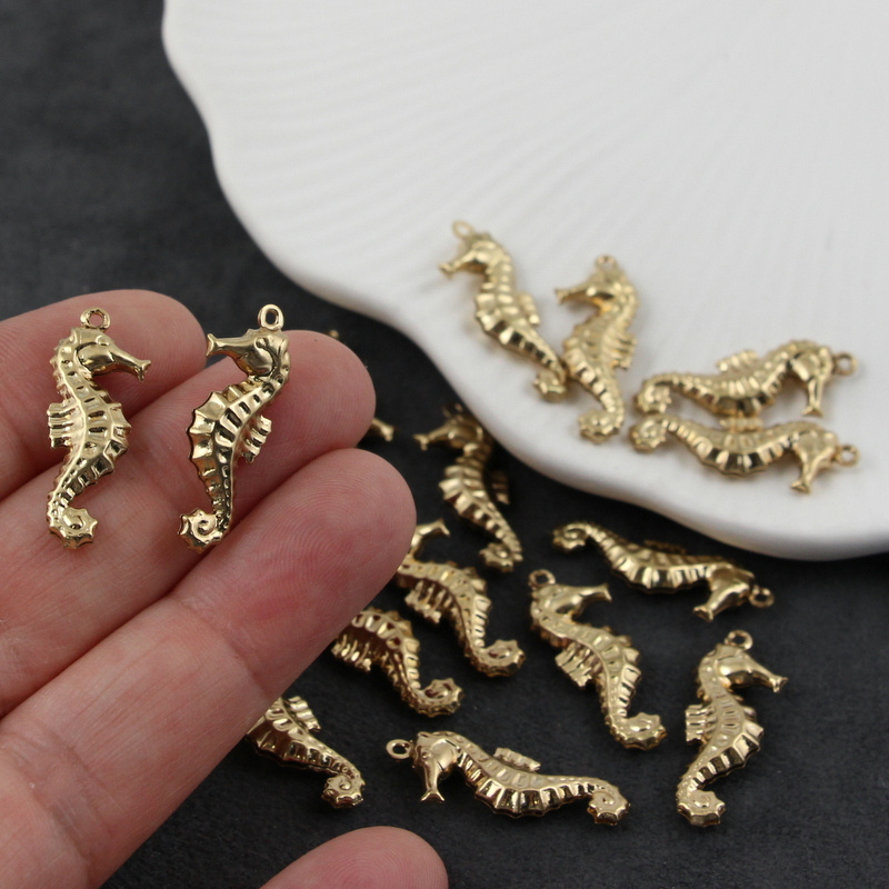 Zawieszki w kształcie konika morskiego, wykonane ze stali szlachetnej 304, pozłacane.
