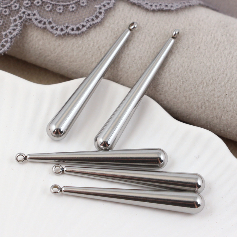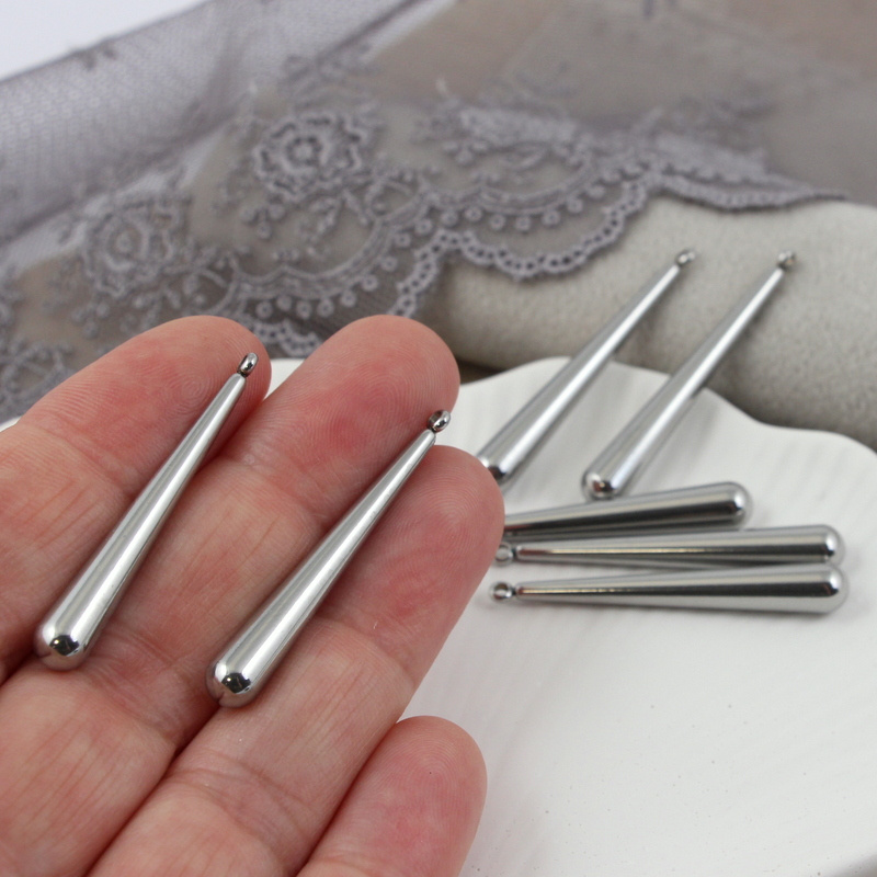 Zawieszka ze stali szlachetnej 304 w kształcie smukłej kropli.