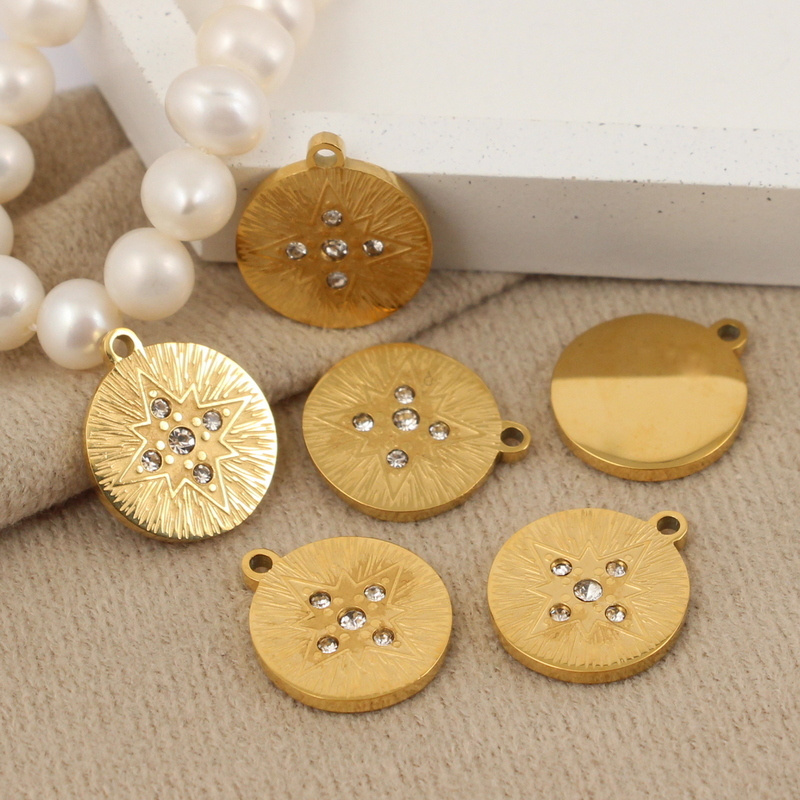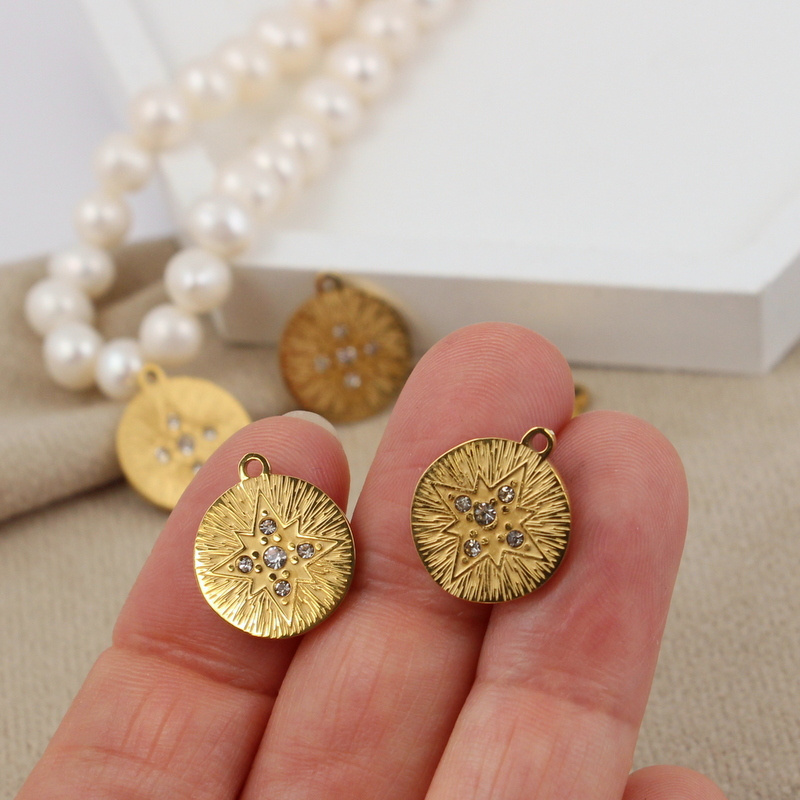 Solidna, gruba zawieszka ze stali szlachetnej, okrągła z motywem gwiazdki i cyrkoniami, tył polerowany, gładki.