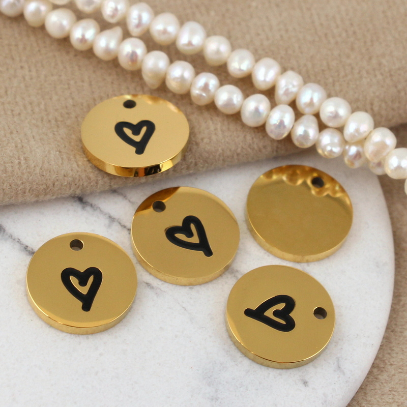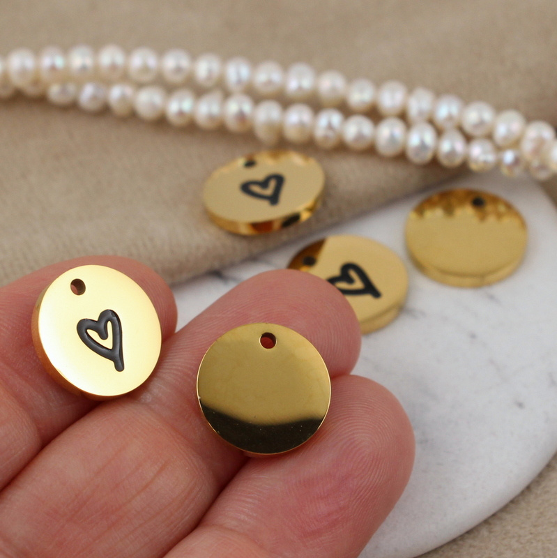 Zawieszka w kształcie monety z motywem serca. Zawieszka ładnie polerowana na błysk. Idealna do bransoletek, kolczyków i naszyjników.