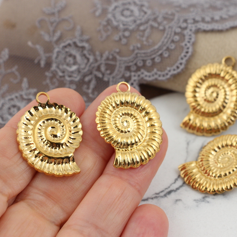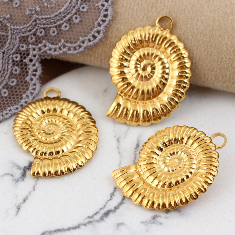Duża zawieszka ze stali szlachetnej 304 w kształcie spiralnej muszli amonita, z ozdobnym żebrowaniem.