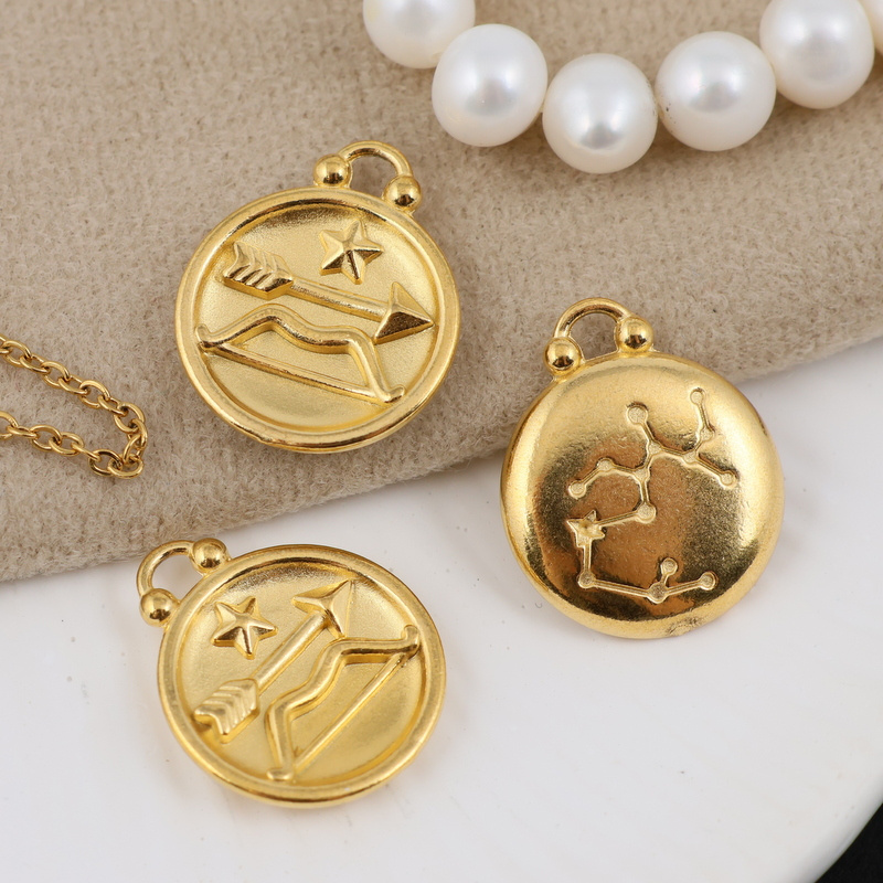 Efektowny element biżuterii o lekko satynowym, złotym wykończeniu, który pięknie odbija światło. Na rewersie znajduje się subtelnie odwzorowana konstelacja Strzelca, czyniąc zawieszkę nie tylko ozdobą, ale także osobistym talizmanem. Solidna forma sprawia, że zawieszka świetnie sprawdza się zarówno noszona samodzielnie na łańcuszku, jak i jako część bardziej rozbudowanych projektów biżuteryjnych. To idealny dodatek dla osób urodzonych pod tym znakiem, a także doskonały pomysł na prezent, biżuterię symboliczną lub amulet wspierający energię zodiaku. Zawieszka świetnie sprawdzi się jako centralny element naszyjnika, bransoletki lub breloka.Stal szlachetna pozłacana.