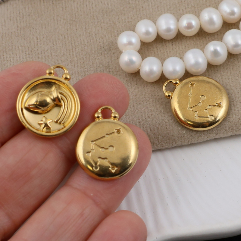 Efektowny element biżuterii o lekko satynowym, złotym wykończeniu, który pięknie odbija światło. Na rewersie znajduje się subtelnie odwzorowana konstelacja Wodnika, czyniąc zawieszkę nie tylko ozdobą, ale także osobistym talizmanem. Solidna forma sprawia, że zawieszka świetnie sprawdza się zarówno noszona samodzielnie na łańcuszku, jak i jako część bardziej rozbudowanych projektów biżuteryjnych. To idealny dodatek dla osób urodzonych pod tym znakiem, a także doskonały pomysł na prezent, biżuterię symboliczną lub amulet wspierający energię zodiaku. Zawieszka świetnie sprawdzi się jako centralny element naszyjnika, bransoletki lub breloka.Stal szlachetna pozłacana.
