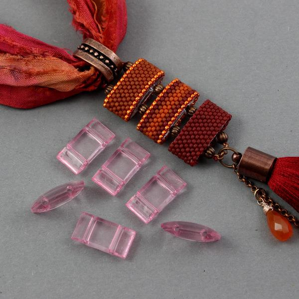 Obszyte prostokąty można potem w dowolny sposób łączyć i wykorzystywać do naszyjników i bransolet.