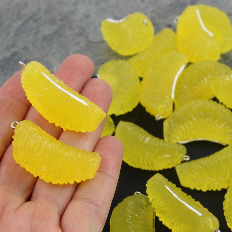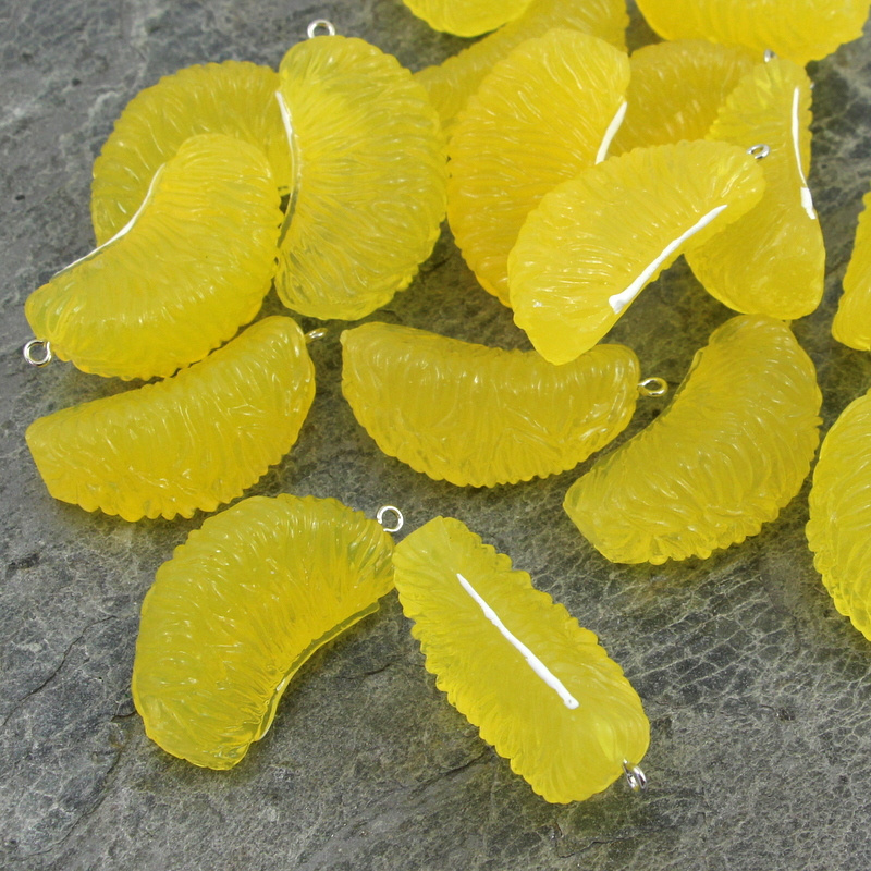 Duże, ale lekkie, bo akrylowe zawieszki w kształcie owocu mandarynki - owoce są bardzo realistyczne i wyglądają soczyście.