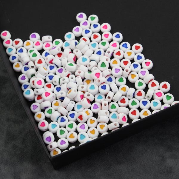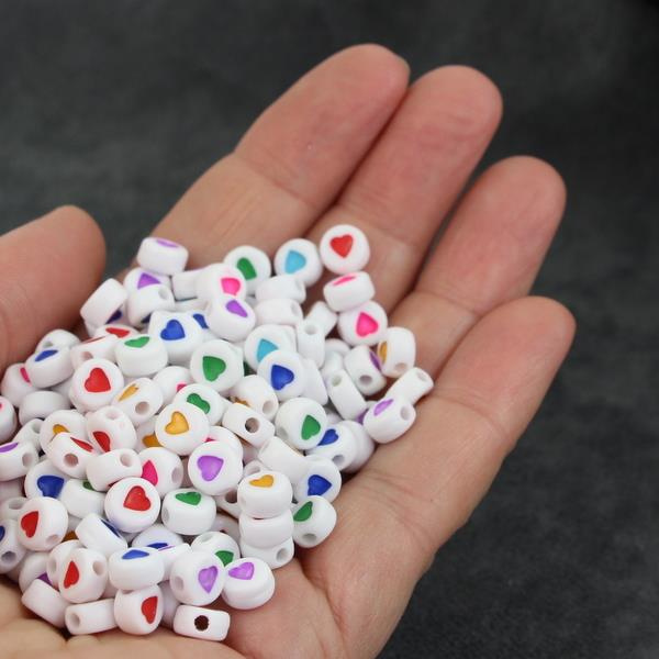 Niewielkie akrylowe koraliki w kolorze białym z namalowanym serduszkiem w różnych kolorach.