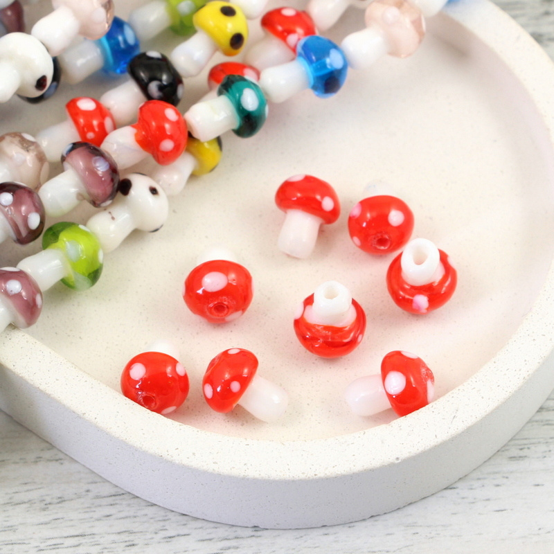 Szklane koraliki w kształcie uroczych grzybków muchomorków, ręcznie malowane, stąd niedoskonałości w pokryciu kolorem.