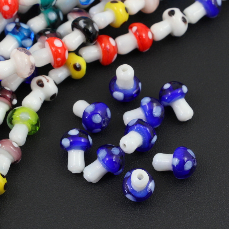 Szklane koraliki w kształcie uroczych grzybków muchomorków, ręcznie malowane, stąd niedoskonałości w pokryciu kolorem.