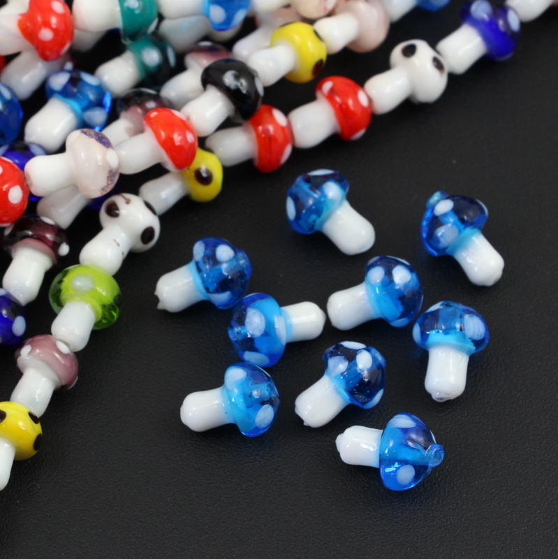 Szklane koraliki w kształcie uroczych grzybków muchomorków, ręcznie malowane, stąd niedoskonałości w pokryciu kolorem.