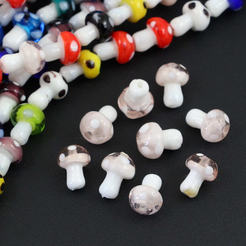 Szklane koraliki w kształcie uroczych grzybków muchomorków, ręcznie malowane, stąd niedoskonałości w pokryciu kolorem.