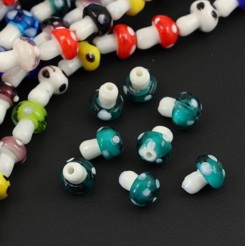Szklane koraliki w kształcie uroczych grzybków muchomorków, ręcznie malowane, stąd niedoskonałości w pokryciu kolorem.