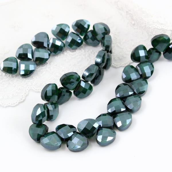 Łezki w kolorze ciemnozielonym. Kryształki z powłoką typu luster - mocno odbijającą światło. Każda strona kryształka nieco inaczej odbija światło - ale obie strony są efektowne.