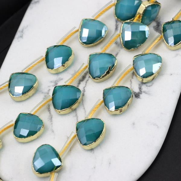 OpisFasetowane szklane łezki w złotej oprawie. Bardzo efektowne, dzięki fasetowanej powierzchni. Wiercone przez wierzchołek.